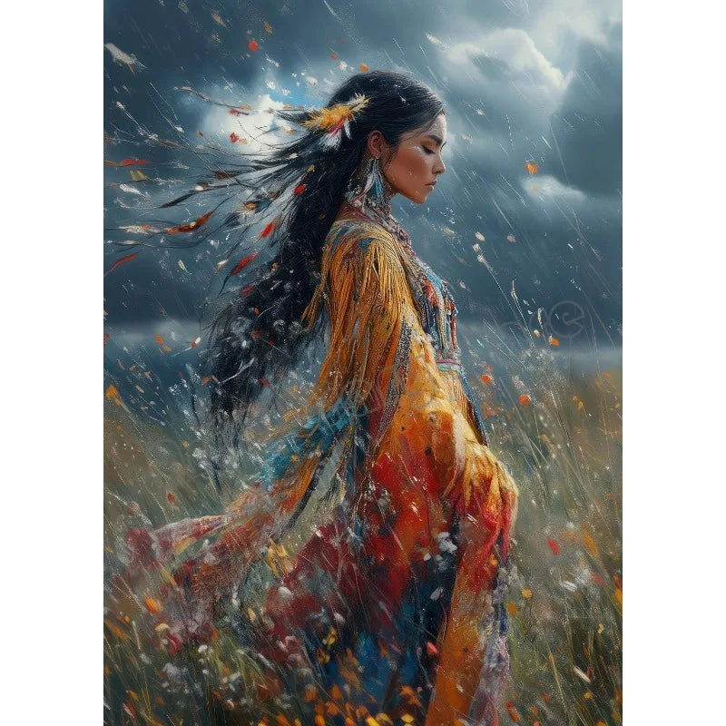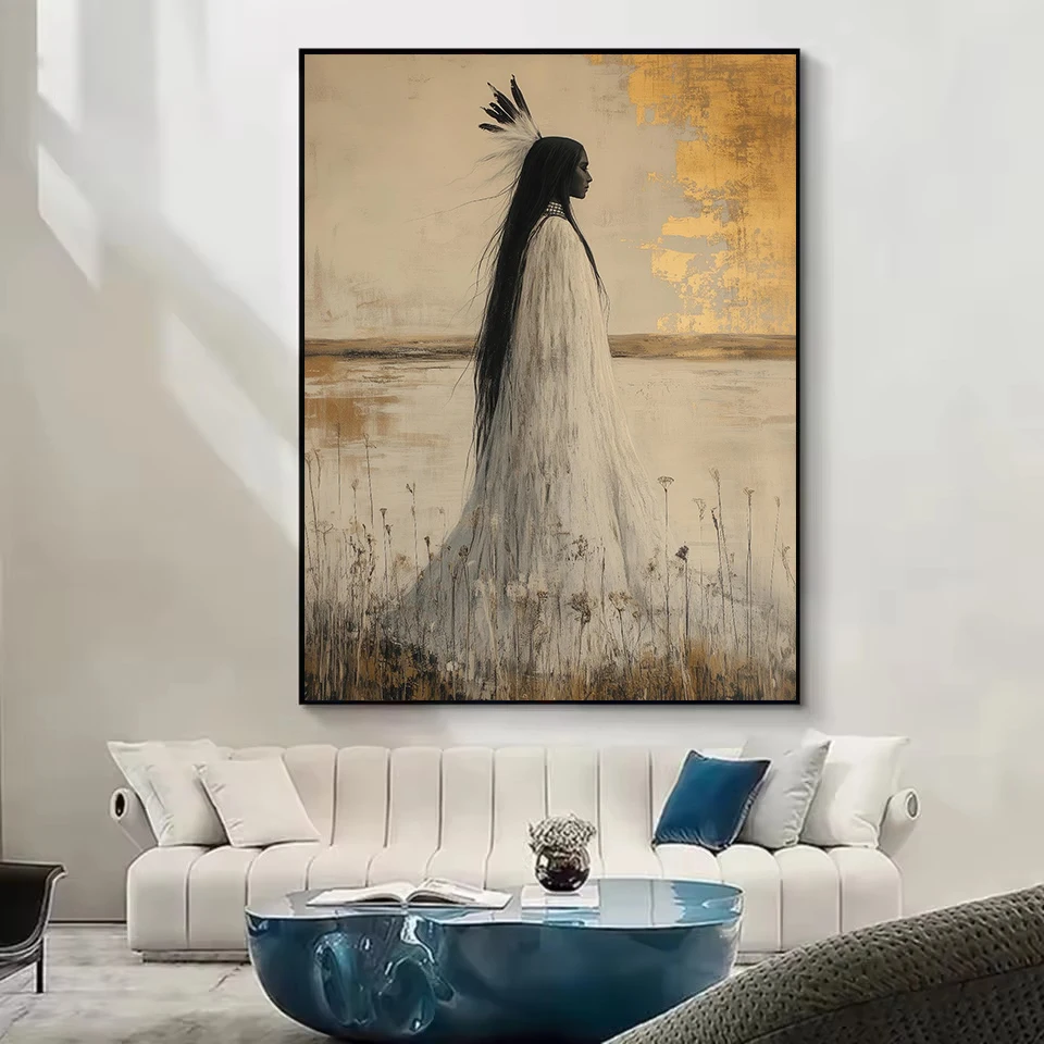 This abstract Native American–inspired goddess wall art print features flowing textures, earthy tones, and symbolic detail, creating a striking visual statement for modern and bohemian interiors.