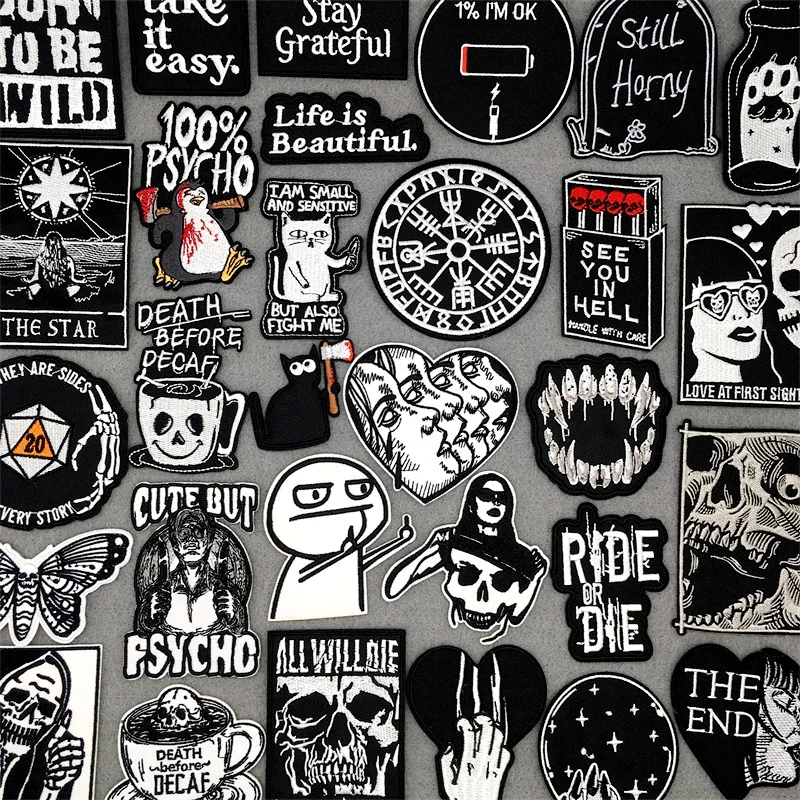 Black & White Embroidered Iron-On Patches – Punk & Skull Designs