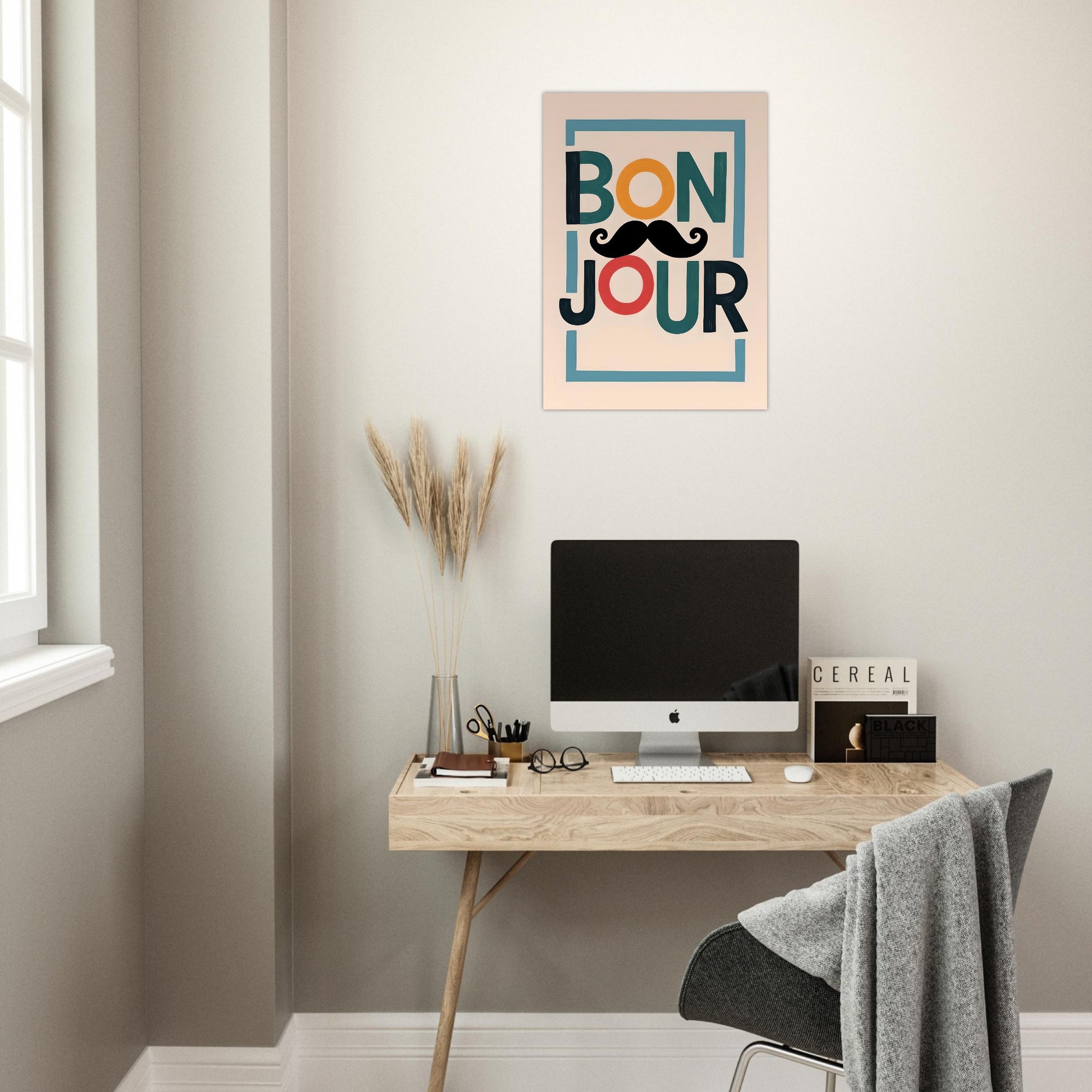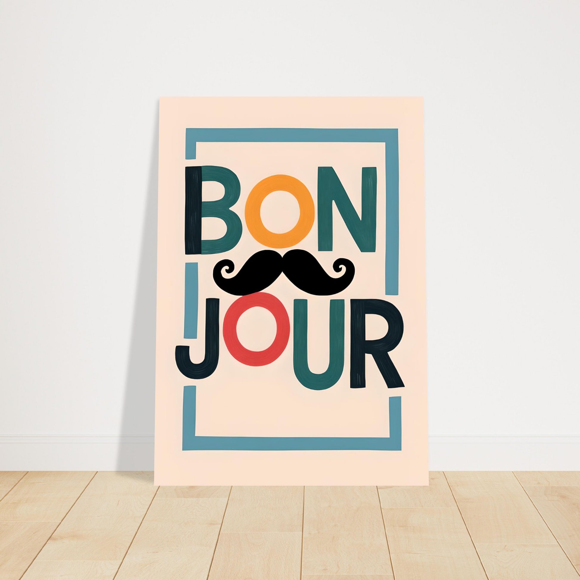 Bonjour Poster - Quirky French Greeting Wall Art with Mustache - Fun Living Room & Café Decor