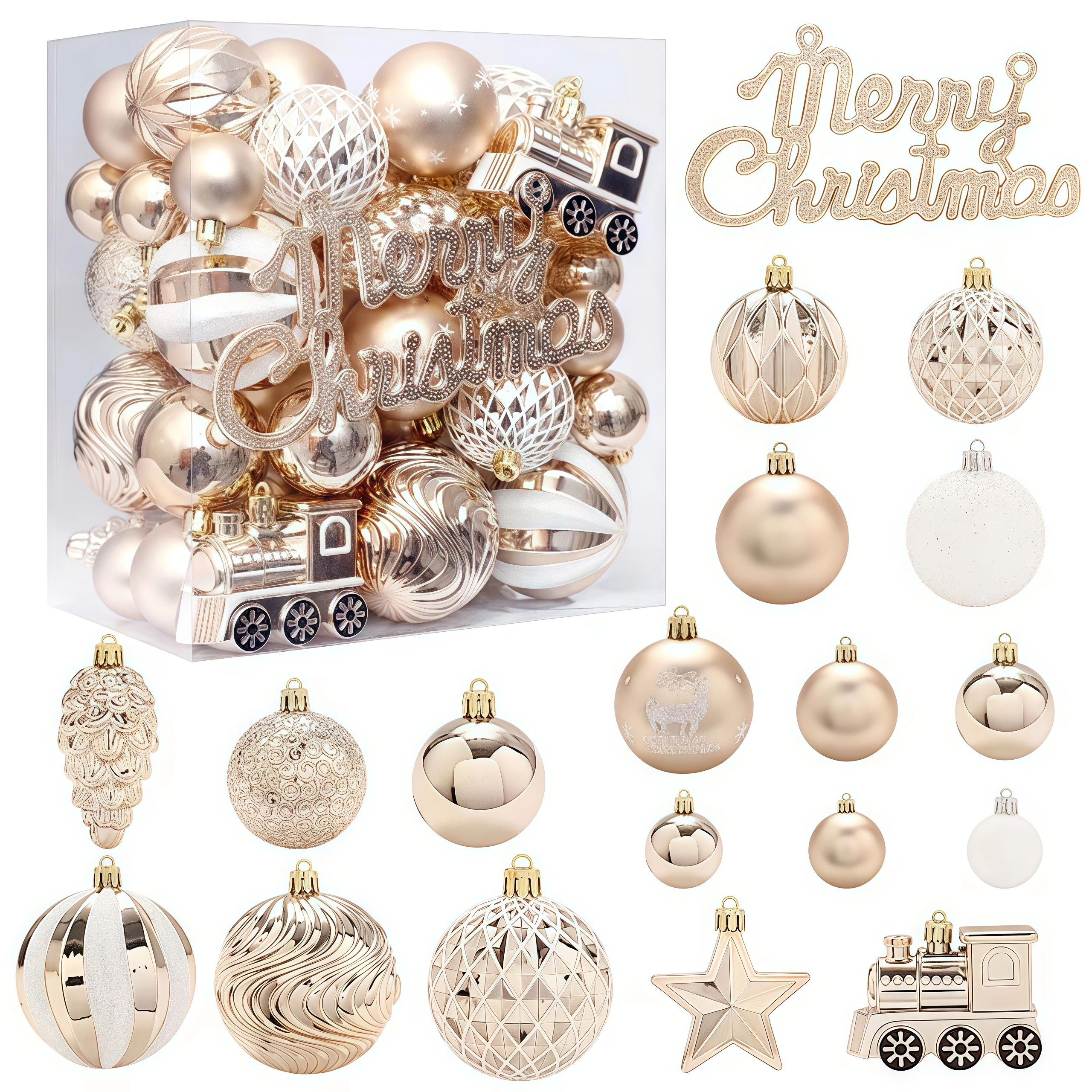 Champagne Gold Christmas Baubles Set – 30–65 Piece Tree Ornament Collection