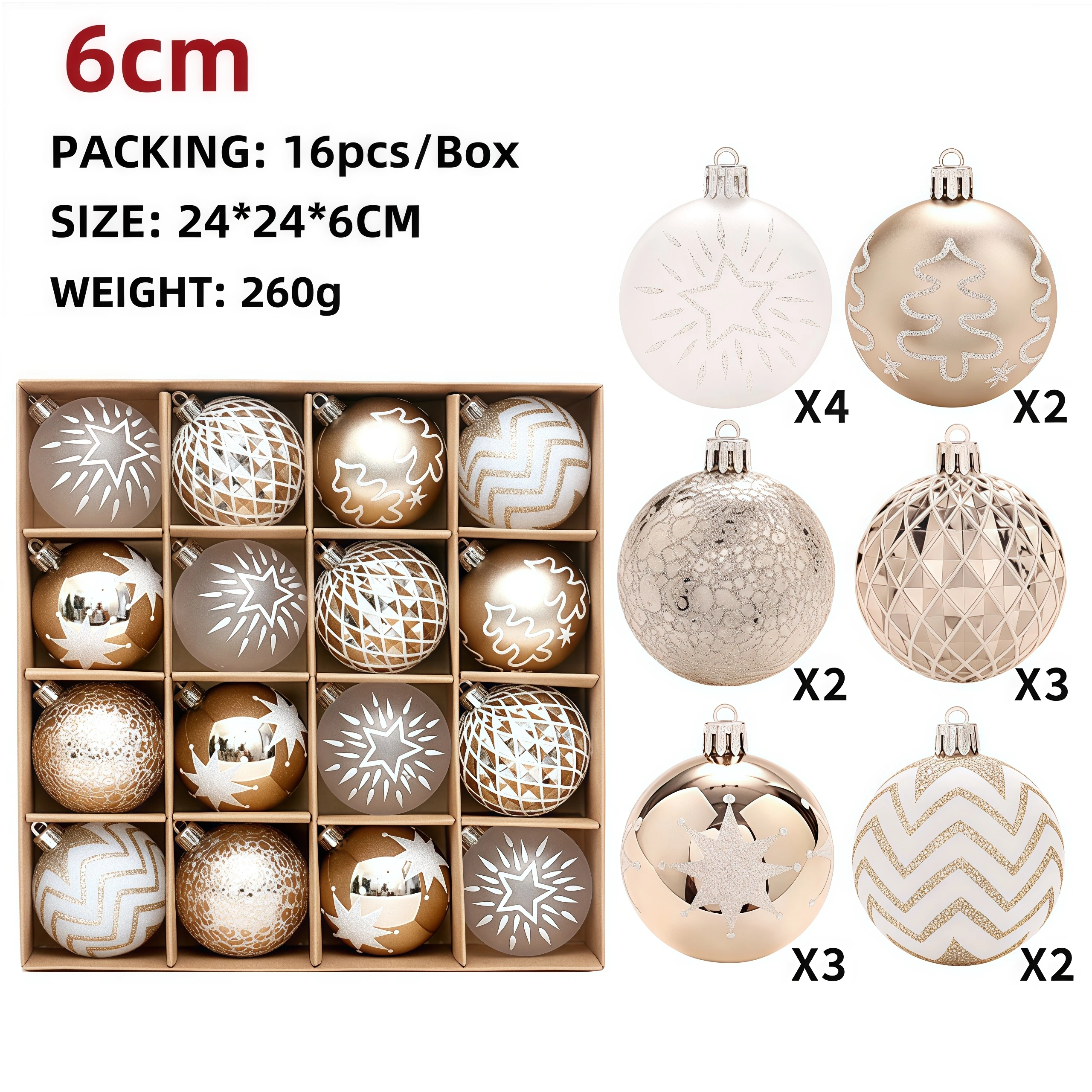 Includes: Mixed-design baubles in coordinated finishes