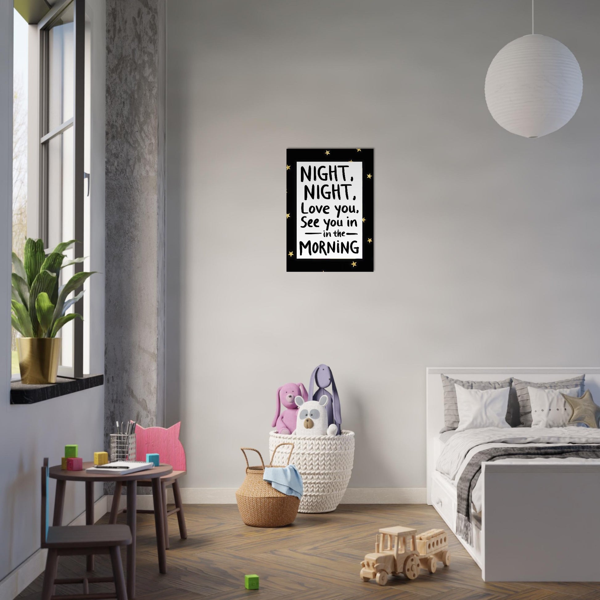 Create a calm and comforting atmosphere with this hand-lettered night quote digital art print, featuring the gentle phrase “Night, night, love you. See you in the morning.” Designed in a playful handwritten style with subtle star accents, this minimal typography artwork is perfect for bedrooms, nurseries, or cosy evening spaces.