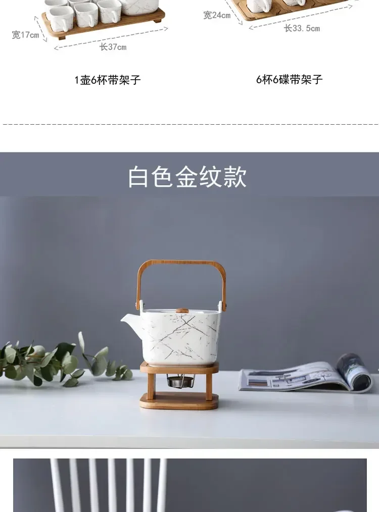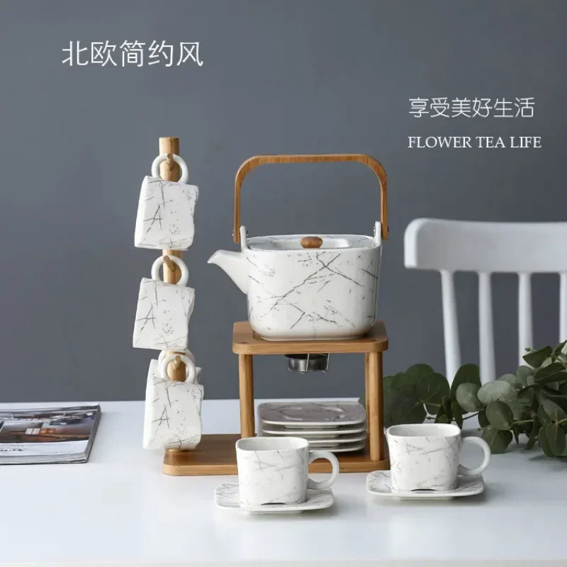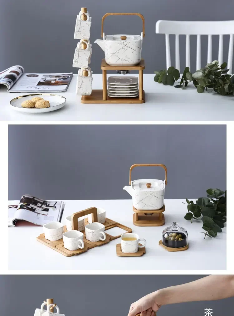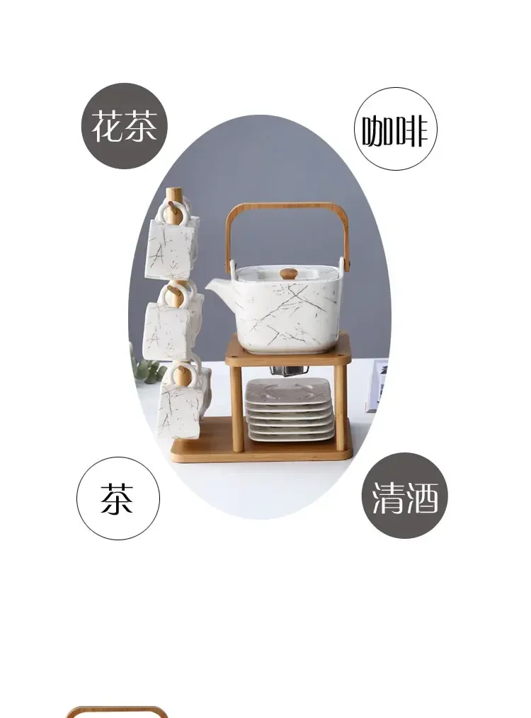 Japanese Ceramic Marble-Effect Teapot & Cup Set with Bamboo Handle and Warmer Stand – 7 Piece Tea & Coffee Set