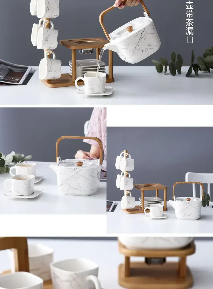 The teapot includes a tealight warmer base to keep your drink at the perfect temperature, while the ergonomic bamboo handle ensures comfortable pouring. Each cup and tray is finished with the same marble texture for a cohesive, minimalist look.