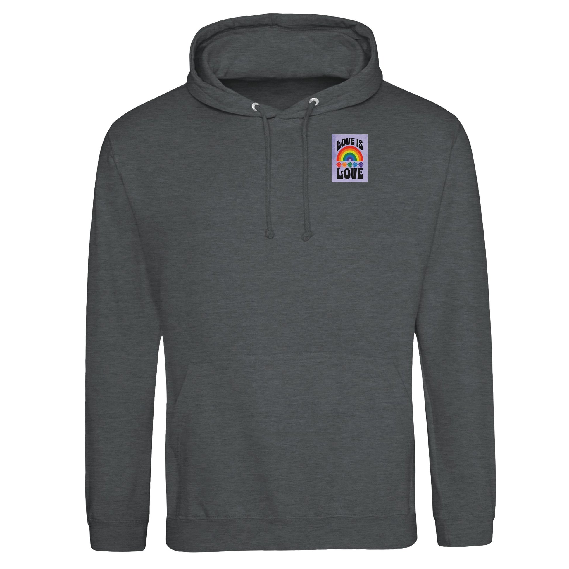 Love Is Love Hoodie – Retro LGBTQ+ Pride Pullover | JustHoods JH001 Premium Unisex Sweatshirt with Rainbow Pocket Print