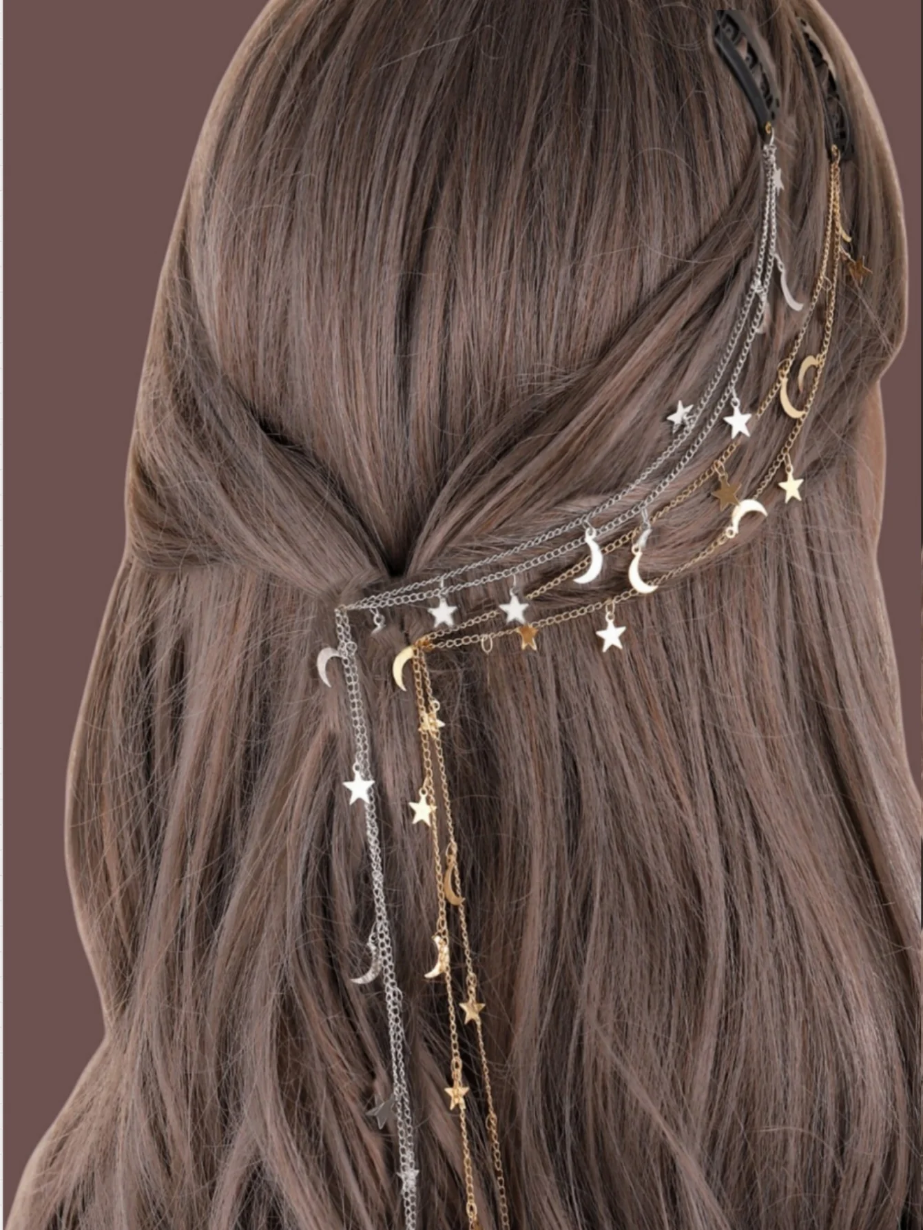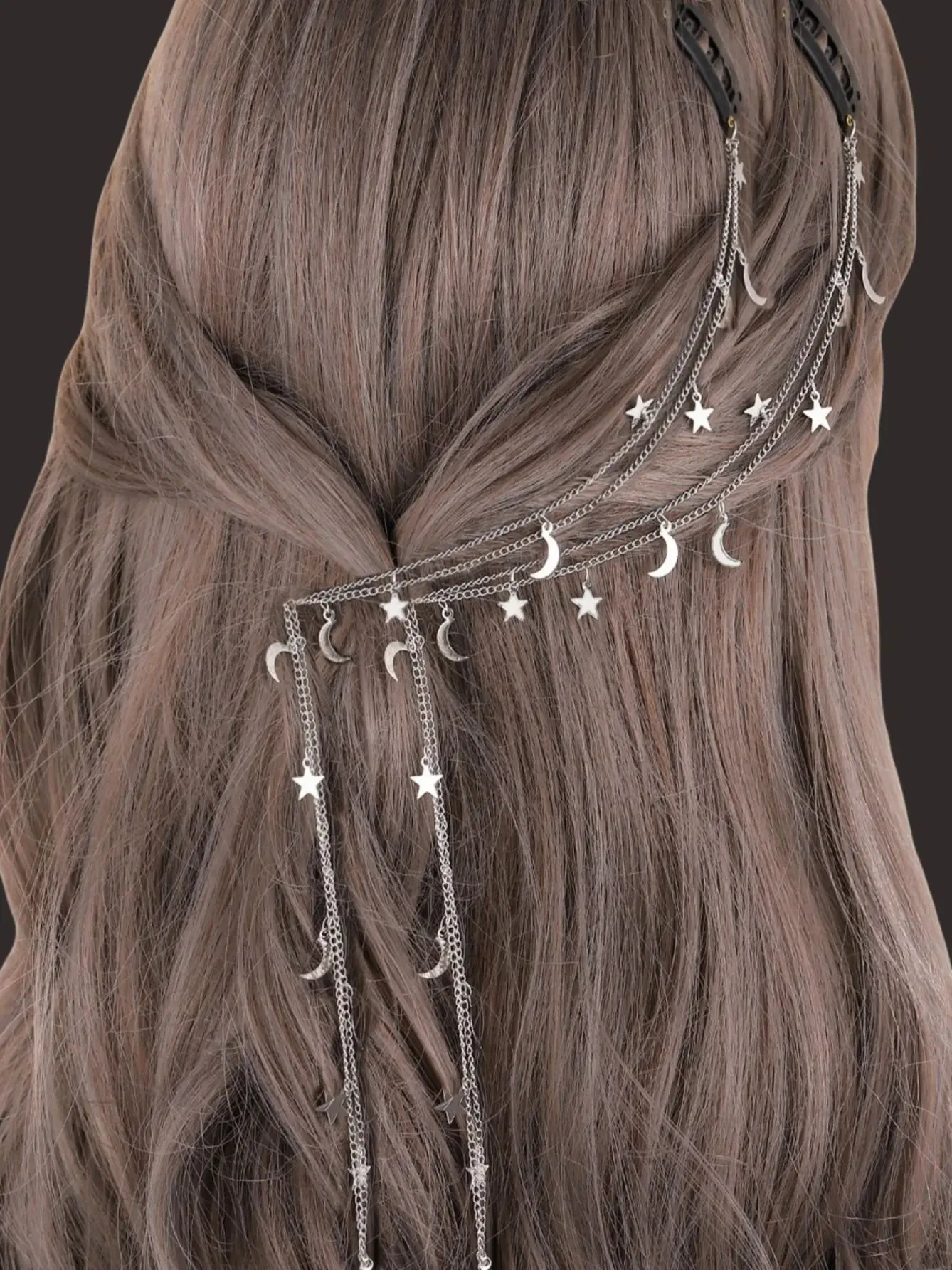 Add a soft celestial touch to your hairstyle with this elegant braided hair chain set. Each chain features delicate moon and star pendants in mixed metallic tones, creating a flowing fairy-style look that drapes beautifully through braids, curls and half-up styles.