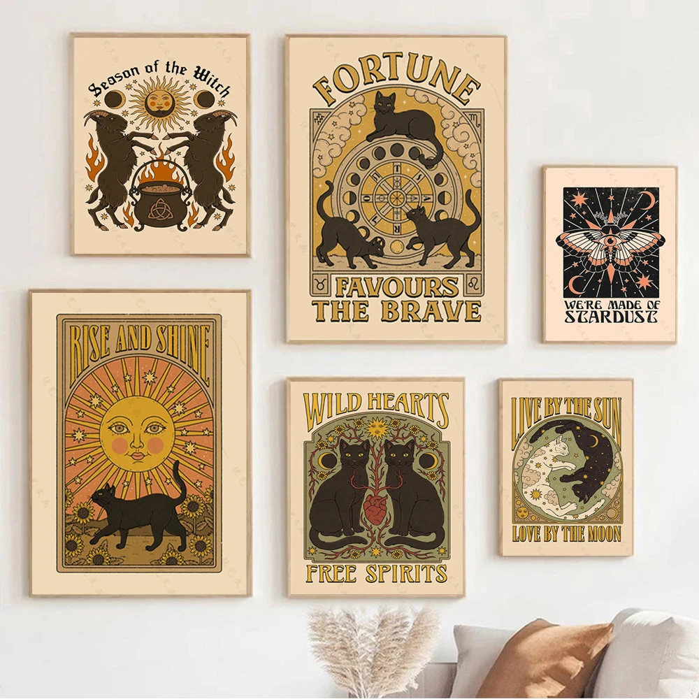 Vintage Celestial Animal Wall Art – Retro Sun Moon & Folklore Style Canvas Print