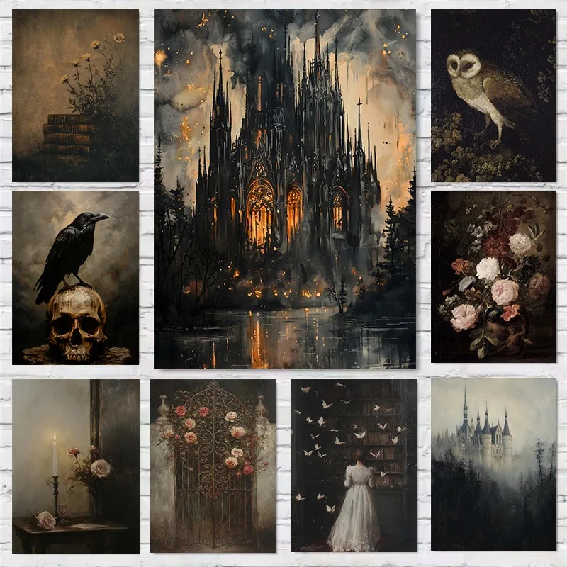 Featuring dramatic architecture, antique books, florals, and wildlife motifs such as owls and crows, this artwork blends elegance with depth and texture.